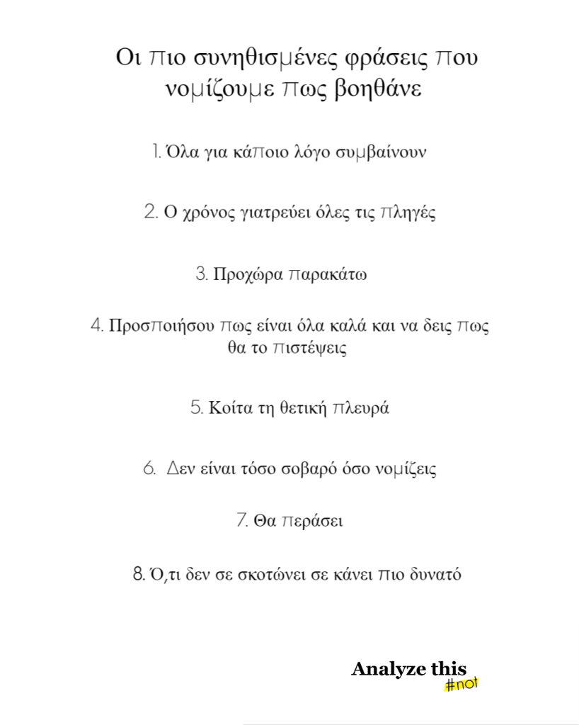Είναι δύσκολο να βλέπουμε κάποιον να ταλαιπωρείται και να αισθανόμαστε ανήμποροι. H ενστικτώδης μας αντίδραση είναι να πούμε κάτι που θα ανακουφίσει εκείνον που μας εκμυστηρεύεται το πρόβλημά του. Ενώ έχουμε τις καλύτερες προθέσεις και πιστεύουμε πως αυτό που λέμε βοηθάει, στην πραγματικότητα τα διάφορα κλισέ που χρησιμοποιούμε προκαλούν μεγαλύτερη δυσαρέσκεια. Δεν χρειάζεται να έχουμε πάντα κάτι να πούμε. Το να ακούμε ή απλά να ρωτήσουμε “Τι χρειάζεσαι;” είναι πολύ πιο θεραπευτικό και ανακουφιστικό για τον άλλον.