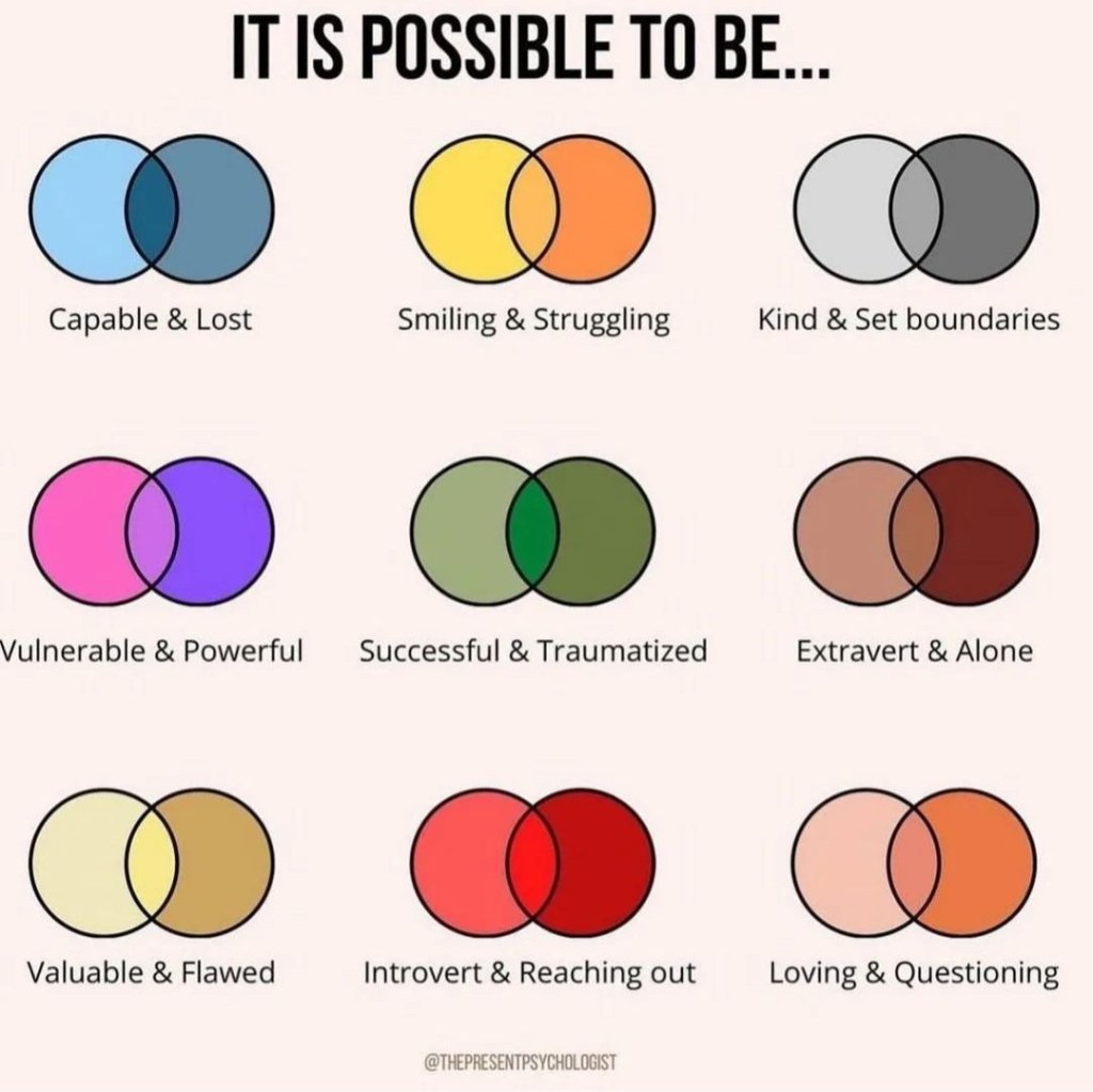 Οι άνθρωποι έχουμε πολλές πλευρές. Δεν είμαστε μόνο ένα πράγμα και πολλές φορές το ίδιο ισχύει και για τα συναισθήματά μας. Δεν είμαστε μόνο οι δυνατότητές μας αλλά και οι περιορισμοί μας. Δεν έχουμε μόνο φωτεινές πλευρές αλλά και σκοτεινές. Όταν δίνουμε χώρο σε όλα μας τα συναισθήματα και σε όλες τις καταστάσεις που αντιμετωπίζουμε χωρίς να κρίνουμε και να χαρακτηρίζουμε κάτι ως καλό ή κακό, μας επιτρέπουμε να είμαστε ολόκληροι και τότε θα μπορούμε να μεγαλώνουμε, να εξελισσόμαστε και αν θέλουμε να αλλάζουμε. Μπορούμε να είμαστε