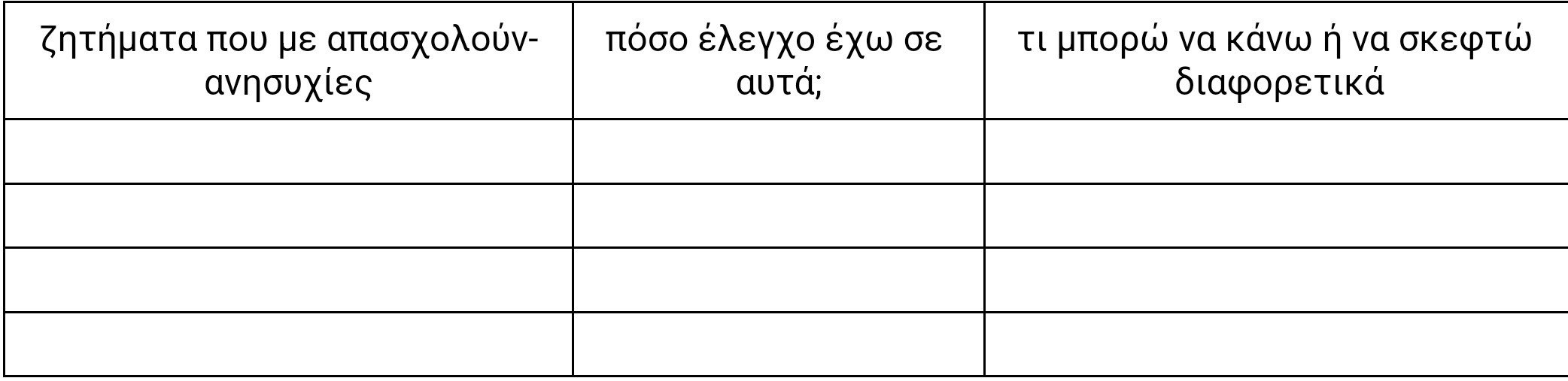 Αυτή η πολύ απλή άσκηση που ακολουθεί, μπορεί να βοηθήσει να γίνουν περισσότερο κατανοητά τα παραπάνω. Στην πρώτη στήλη συμπληρώστε αυτά που σας απασχολούν, τις ανησυχίες σας. Στη δεύτερη το βαθμό ελέγχου που έχετε και στην τρίτη τι μπορείτε να κάνετε και κυρίως να σκεφτείτε διαφορετικά, να νοηματοδοτήσετε με διαφορετικό τρόπο αυτό που σας απασχολεί.