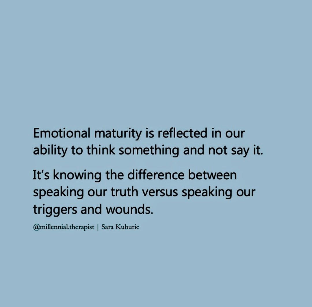 Συναισθηματική ωριμότητα είναι κάτι που φαίνεται και από την εγκράτειά μας να μη λέμε πάντα αυτό που σκεφτόμαστε. Να καταλαβαίνουμε τη διαφορά μεταξύ του να λέμε την αλήθεια μας και να μιλάμε ή να απαντάμε επειδή κάτι πυροδότησε ένα παλιό τραύμα.